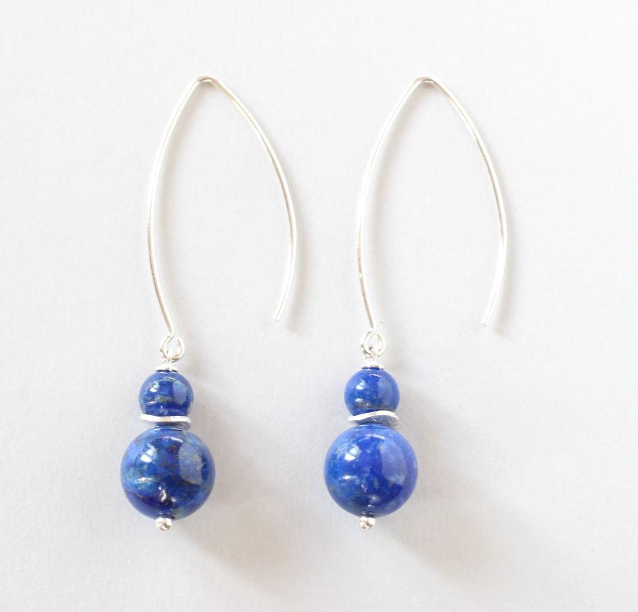 These handmade lapis lazuli silver earrings feature smooth, round lapis lazuli gemstones paired beautifully with sterling silver. Sterling silver beads are placed between each gemstone, and the design is carefully wire-wrapped and finished with long oval sterling silver ear wires.